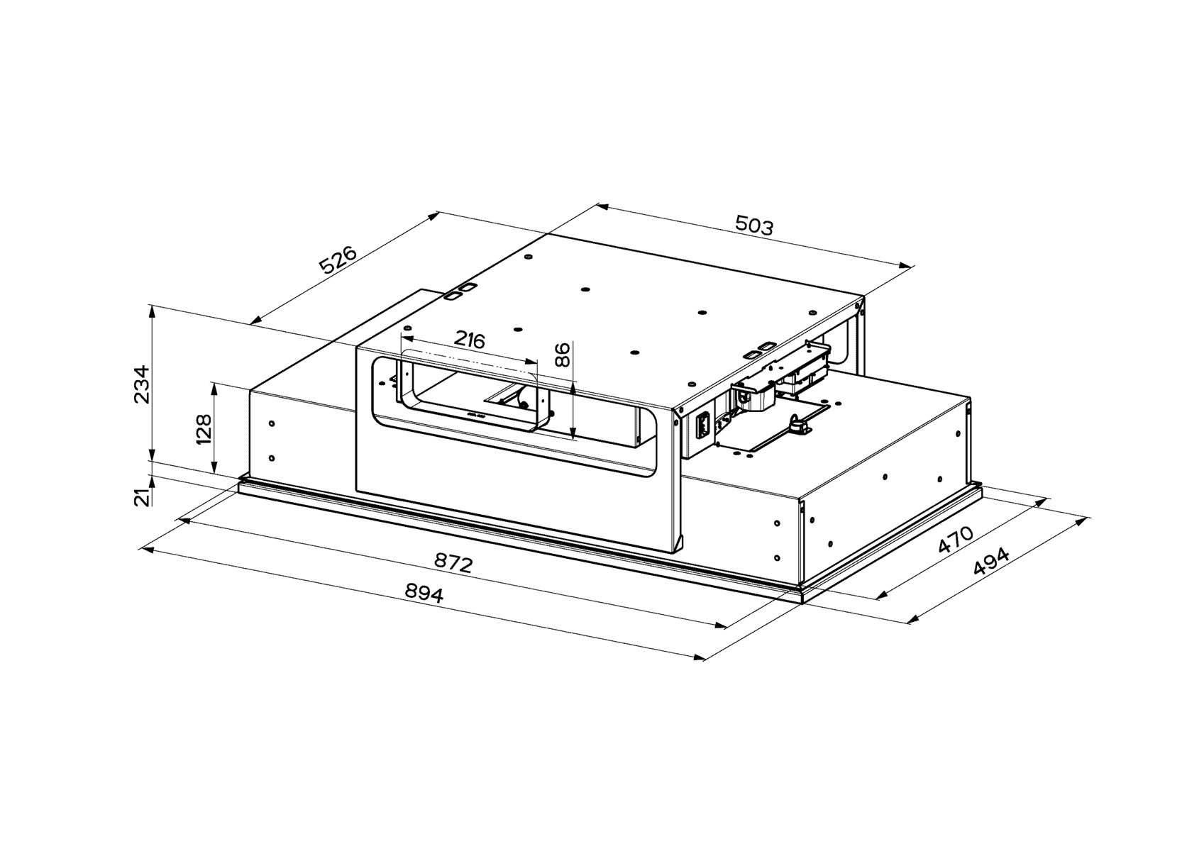 This ceiling cooker hood features three power settings with an additional intensive speed function, as well as impressive perimeter aspiration. Not only does this feature accelerate air flow, but it also helps to reduce noise.